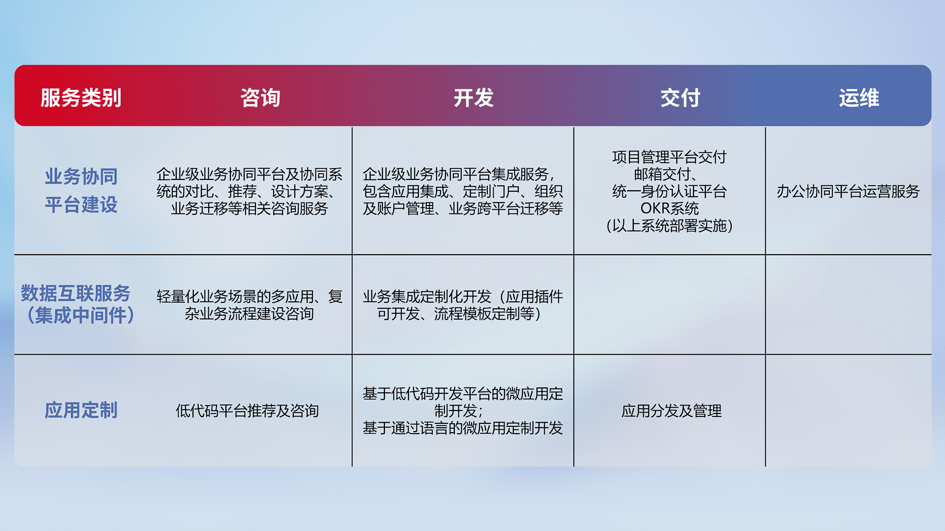 针对钉钉、、企微、、、IDaas等平台级产品提供产品的规划、、方案、、交付、、、、定制化开发等服务,,实现如统一协同办公、、、智能客户服务、、混合会议管理、、智能数据查询、、、、等业务场景,,实现数字化转型。。。。